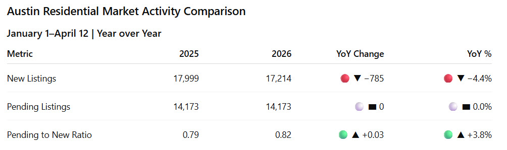 Austin residential (Jan 1–Apr 12): new listings are down 4.4% YoY, pending contracts are flat YoY, and absorption has improved to 0.82. Fewer homes hitting the market and demand holding steady.